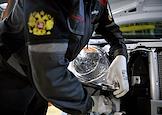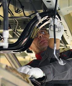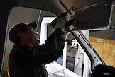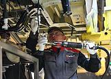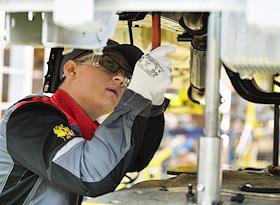 Работа производства ООО "СОЛЛЕРС Алабуга" в Елабужском муниципальном районе. Производство модельной линейки легких коммерческих автомобилей под брендом СОЛЛЕРС. Сотрудник производства во время сборки автомобиля Sollers Atlant на конвейере в цехе.