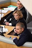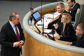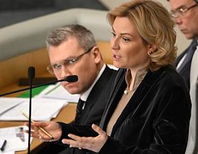 Пленарное заседание Государственной думы (ГД) России. Министр культуры России Ольга Любимова (вторая справа) и заместитель председателя ГД России Петр Толстой (слева) во время заседания.