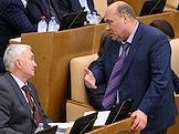 Пленарное заседание Государственной думы (ГД) России. Член комитета ГД России по строительству и жилищно-коммунальному хозяйству Виталий Бахметьев (справа) и член комитета ГД России по развитию гражданского общества, вопросам общественных и религиозных объединений Александр Ильтяков (слева) во время заседания.