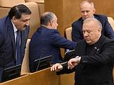 Пленарное заседание Государственной думы (ГД) России. Член комитета ГД России по энергетике Джамаладин Гасанов (слева) и заместитель председателя комитета ГД России по развитию гражданского общества, вопросам общественных и религиозных объединений Владимир Шаманов (справа) во время заседания.