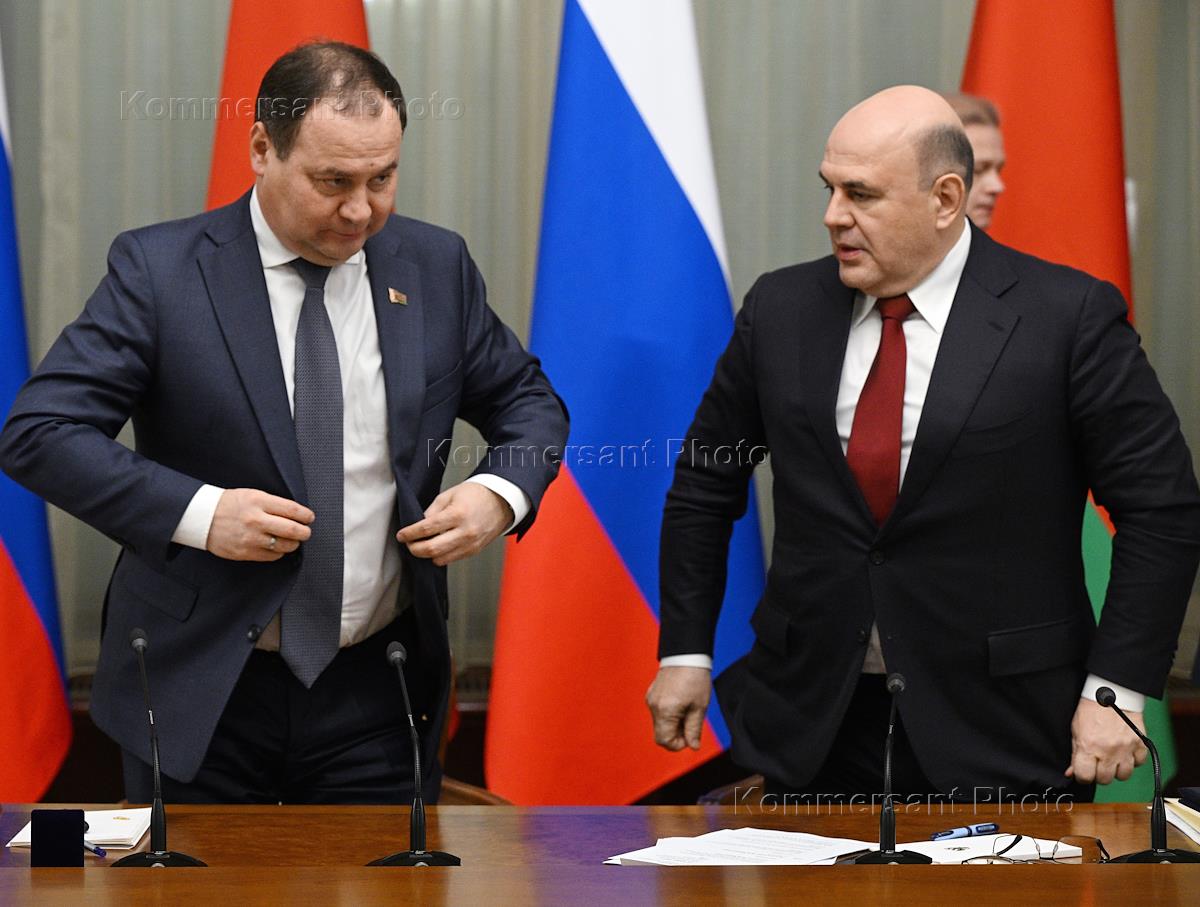 Заседание Совета министров Союзного государства России и Белоруссии в Доме правительства России. Председатель правительства России Михаил Мишустин (справа) и премьер-министр Белоруссии Роман Головченко (слева) перед началом заседания.