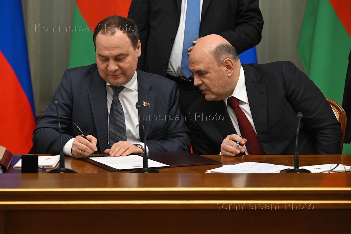 Заседание Совета министров Союзного государства России и Белоруссии в Доме правительства России. Председатель правительства России Михаил Мишустин (справа) и премьер-министр Белоруссии Роман Головченко (слева) во время подписания документов, по итогам заседания.