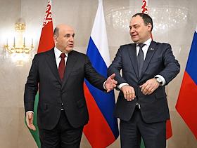 Заседание Совета министров Союзного государства России и Белоруссии в Доме правительства России. Председатель правительства России Михаил Мишустин (справа) и премьер-министр Белоруссии Роман Головченко (слева) перед началом заседания.
