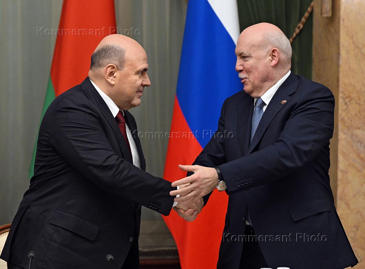 Заседание Совета министров Союзного государства России и Белоруссии в Доме правительства России. Председатель правительства России Михаил Мишустин (справа) и премьер-министр Белоруссии Роман Головченко (слева) перед началом заседания.