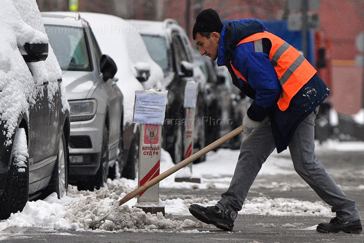 Виды Москвы. Жанровая фотография. Сотрудник коммунального хозяйства во время уборки снега с тротуара.