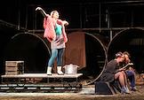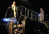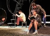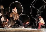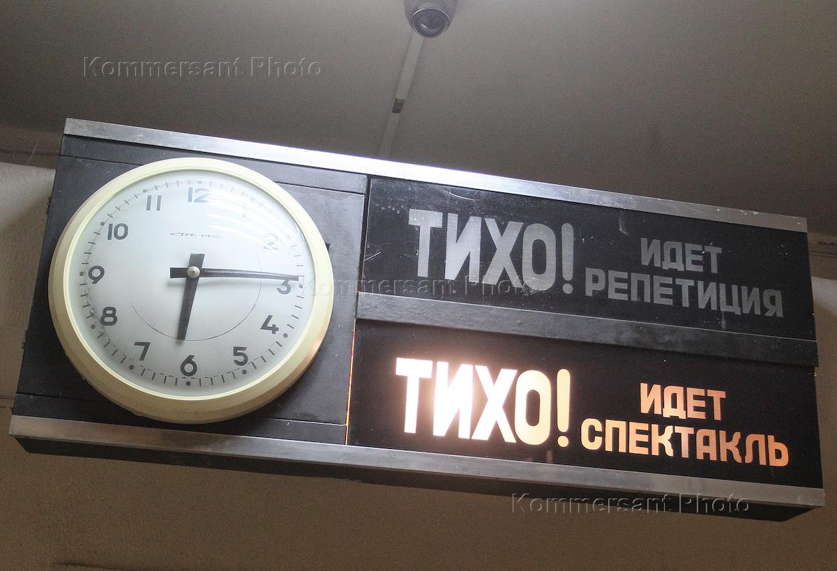 The play "At the Lower Depths" with audio commentary for the visually impaired at the regional Drama Theater named after Gorky. Genre photography. Clock and display "Quiet! The Performance is in progress."