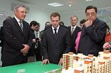 Полномочный представитель Президента России в Сибирском федеральном округе (СФО)Анатолий Квашнин (слева), первый заместитель председателя Правительства России Дмитрий Медведев (в центре) и губернатор Кемеровской области Аман Тулеев (справа) во время посещения одного из предприятий в Кемеровской области.