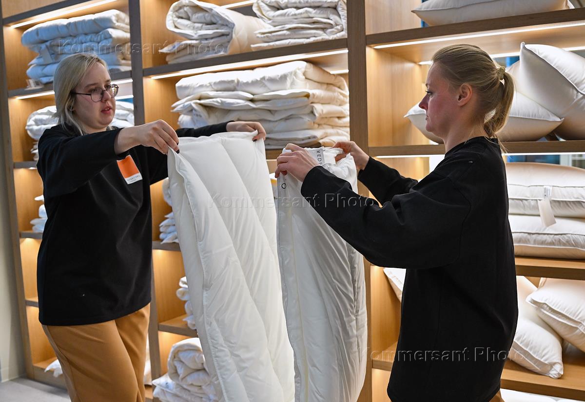 Магазин российского бренда Redecoro, занявшего нишу после ухода брендов Zara Home и H&M Home, в торговом центре "Метрополис". Жанровая фотография. Покупатели в торговом зале магазина.