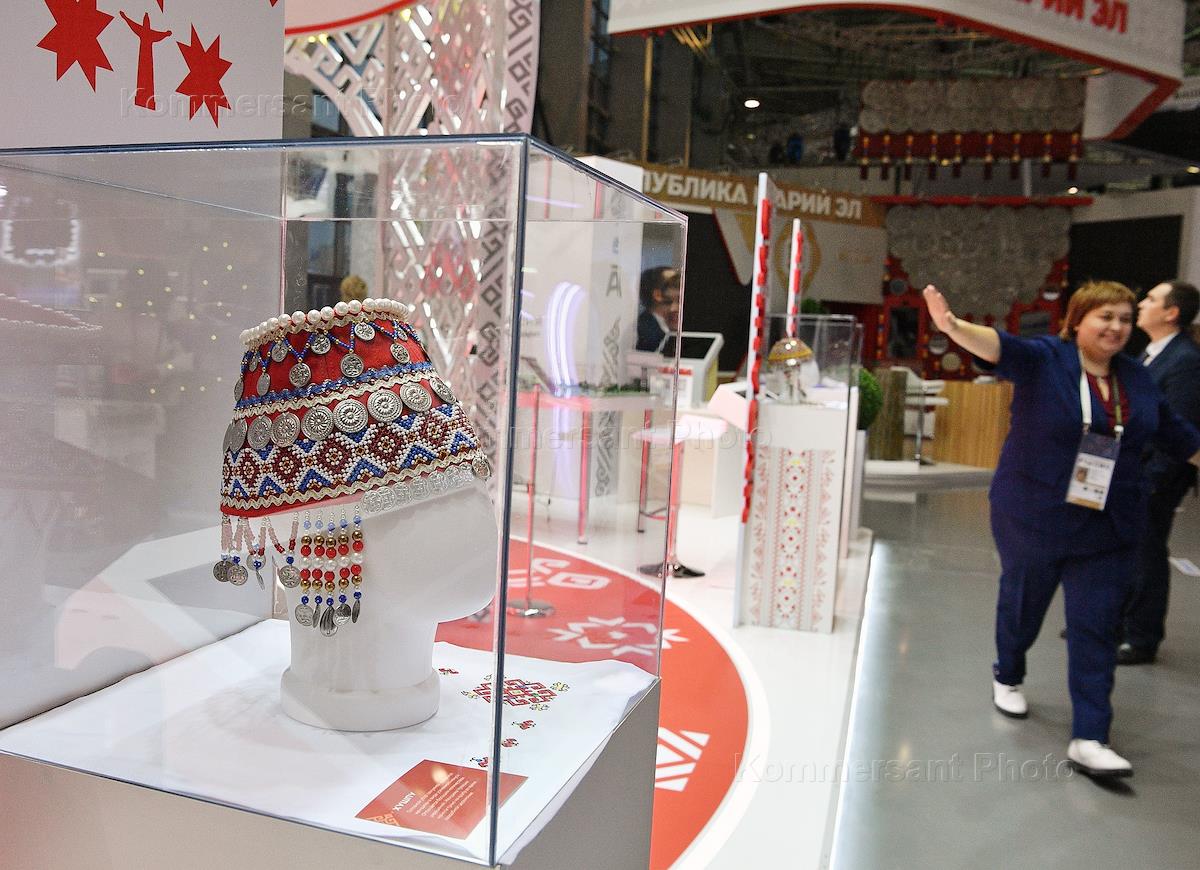 Международный выставка-форум "Россия" на ВДНХ. Стенды регионов России в 75 павильоне. Жанровая фотография. Стенд Чувашской Республики. Хушпу — чувашский головной убор замужних женщин.