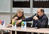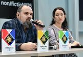 Международная ярмарка интеллектуальной литературы "non/fictio№25" в Гостином дворе. Презентация трехтомника о Донбассе — "#ЖивиДонбасс", "#ДонбассЖивет", "#ЮныйДонбасс". Председатель Союза литераторов России Николай Калиниченко (слева) и художник-иллюстратор Анна Дербенева (справа) во время презентации.