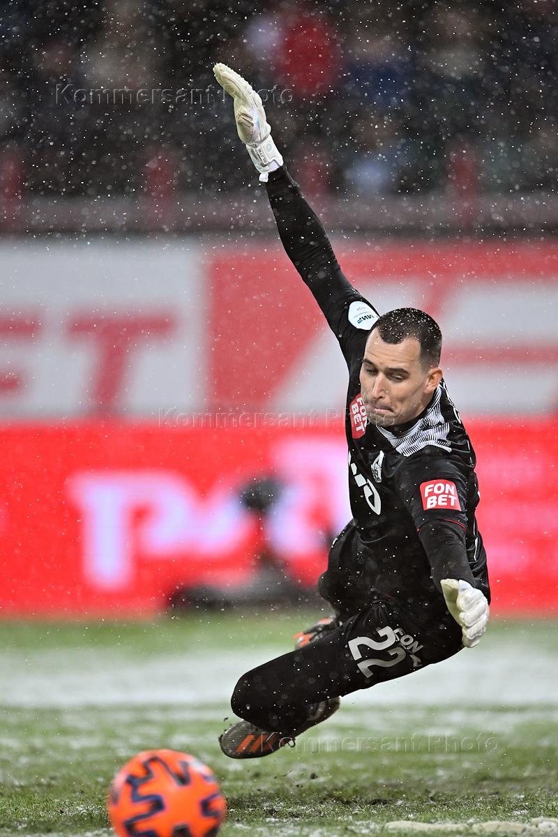 Российская Премьер-Лига (РПЛ). МИР - Чемпионат России по футболу 2023/2024. 17-й тур. Матч между командами "Локомотив М" (Москва) - "Зенит" Санкт-Петербург) на стадионе "РЖД Арена". Вратарь команды "Локомотив М" Илья Лантратов во время матча.