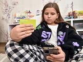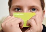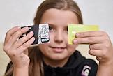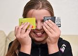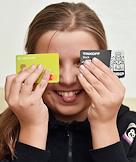 Жанровая фотография. Девочка держит детские банковские карты "Сбер Kids" и Tinkoff Blak.