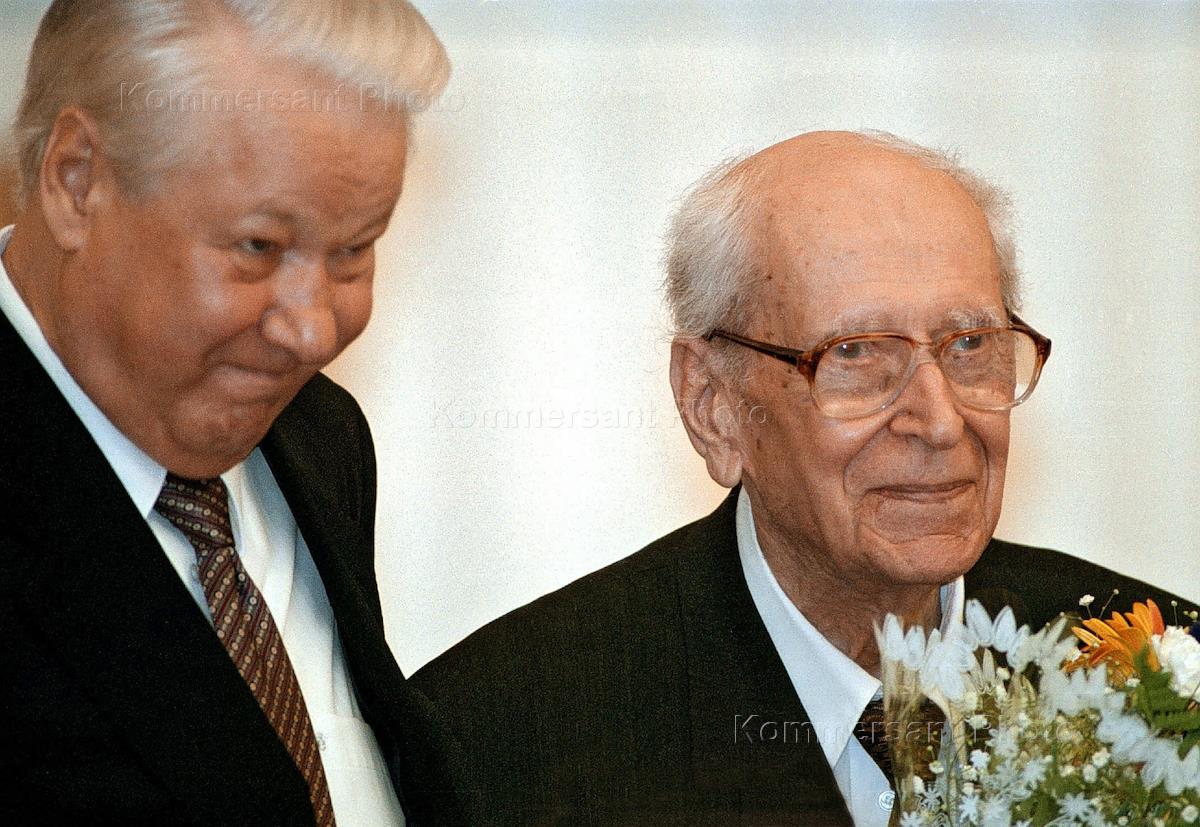 Russian President Boris Yeltsyn (left) and Dmitri Likhachyov.