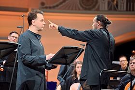Концерт "Десятников. "Opera" – балет. Гендель. Арии из опер" в Концертном зале имени П.И.Чайковского. Оперный певец Сергей Годин (слева) и руководитель оркестра La voce strumentale Нижегородского государственного академического театра оперы и балета имени А.С.Пушкина дирижер Дмитрий Синьковский (справа) во время выступления.