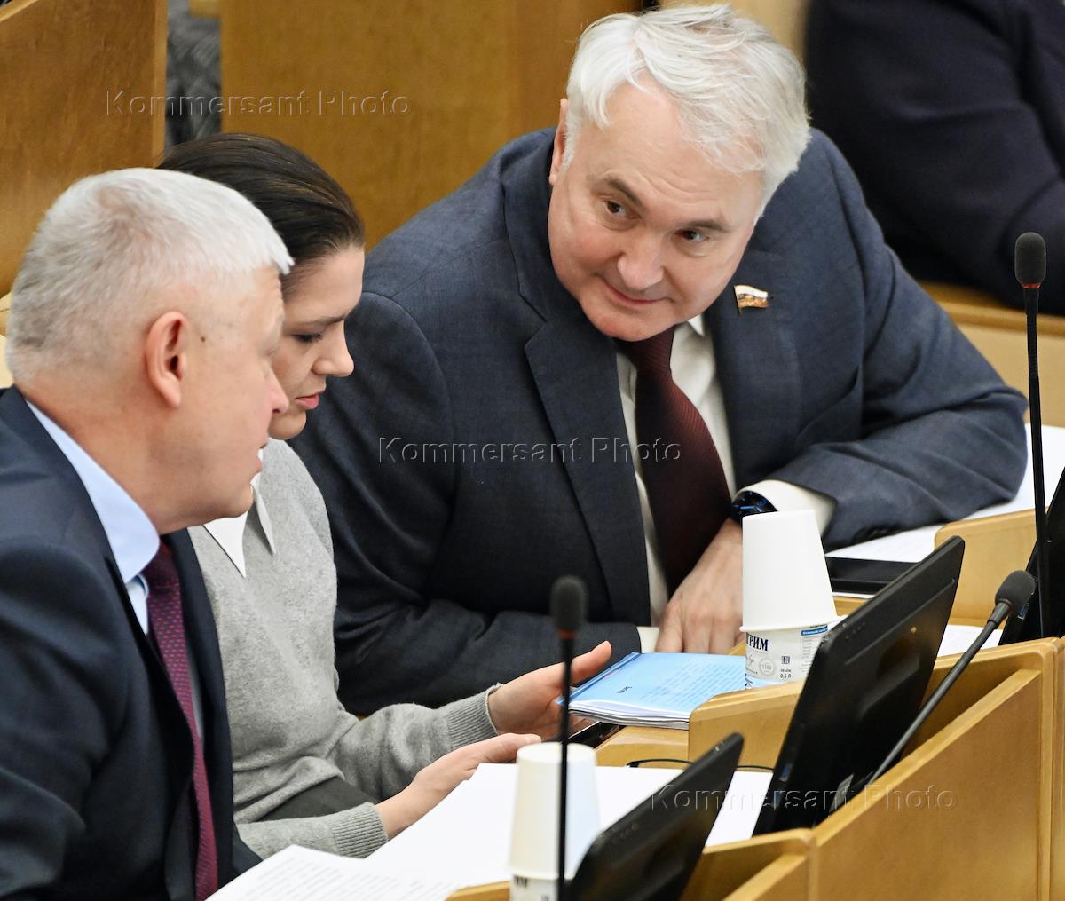 Пленарное заседание Государственной думы (ГД) России. Слева направо: заместитель председателя комитета ГД России по физической культуре и спорту Сергей Бурлаков, первый заместитель председателя комитета ГД России по просвещению Алена Аршинова и председатель комитета ГД России по экологии, природным ресурсам и охране окружающей среды Дмитрий Кобылкин во время заседания.