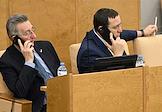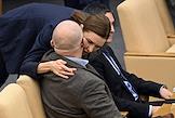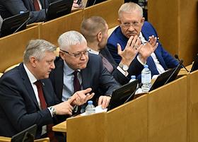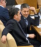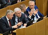 Пленарное заседание Государственной думы (ГД) России. Члены комитета ГД России по транспорту и развитию транспортной инфраструктуры Ринат Аюпов (в центре) и Александр Щербаков (справа) во время заседания.