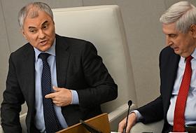 Пленарное заседание Государственной думы (ГД) России. Председатель ГД России Вячеслав Володин (слева) и первый заместитель председателя ГД России Иван Мельников (справа) во время заседания.