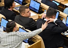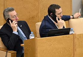 Пленарное заседание Государственной думы (ГД) России. Член комитета ГД России по экологии, природным ресурсам и охране окружающей среды Азат Ягафаров (слева) и член комиссии ГД России по Регламенту и обеспечению деятельности Государственной Думы Раиса Кармазина (справа) во время заседания.