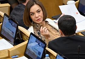 Пленарное заседание Государственной думы (ГД) России. Заместитель председателя комитета ГД России по молодежной политике Юлия Саранова (слева) во время заседания.