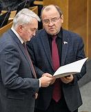 Пленарное заседание Государственной думы (ГД) России. Член комитета ГД России по транспорту и развитию транспортной инфраструктуры Виталий Ефимов (слева) и первый заместитель председателя комитета ГД России по развитию Дальнего Востока и Арктики Вячеслав Логинов (справа) во время заседания.