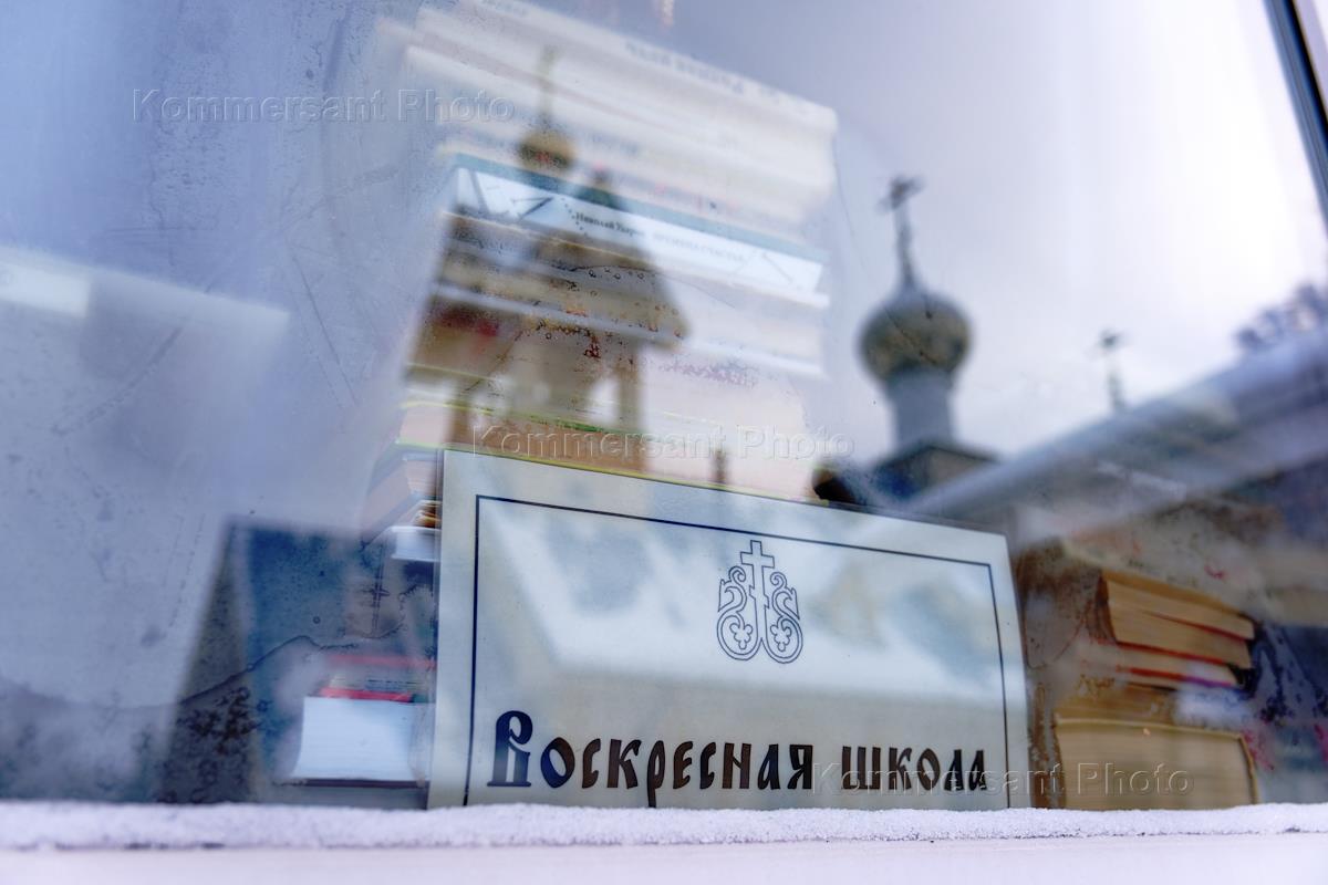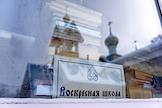 Воскресная школа храма святителя Василия Великого в Осиновой Роще. Жанровая фотография. Табличка "Воскресная школа" в окне и отражение храма на стекле.