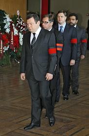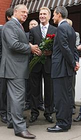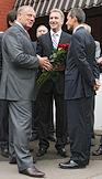 Помощник президента России Игорь Шувалов (в центре) и заместитель министра экономического развития и торговли России Андрей Шаронов (справа) на гражданской панихиде по Аркадию Вольскому в Дворце культуры "ЗИЛ". Почетный президент Российского союза промышленников и предпринимателей (РСПП) Аркадий Вольский скончался 9 сентября на 75-м году жизни после продолжительной болезни.