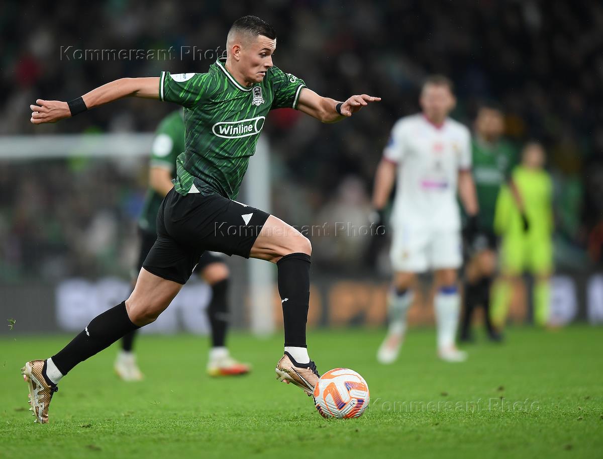 Российская Премьер-Лига (РПЛ). МИР - Чемпионат России по футболу 2023/2024. 18-й тур. Матч между командами "Краснодар" (Краснодар) - ЦСКА (Москва) на стадионе "ФК Краснодар". Игрок команды "Краснодар" Никита Кривцов во время матча.