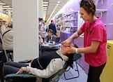 Неделя красоты в Москве. Посетительница на сеансе массажа лица международной выставки косметической промышленности и индустрии красоты.