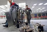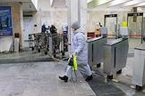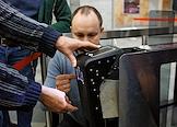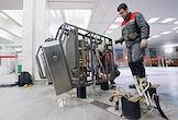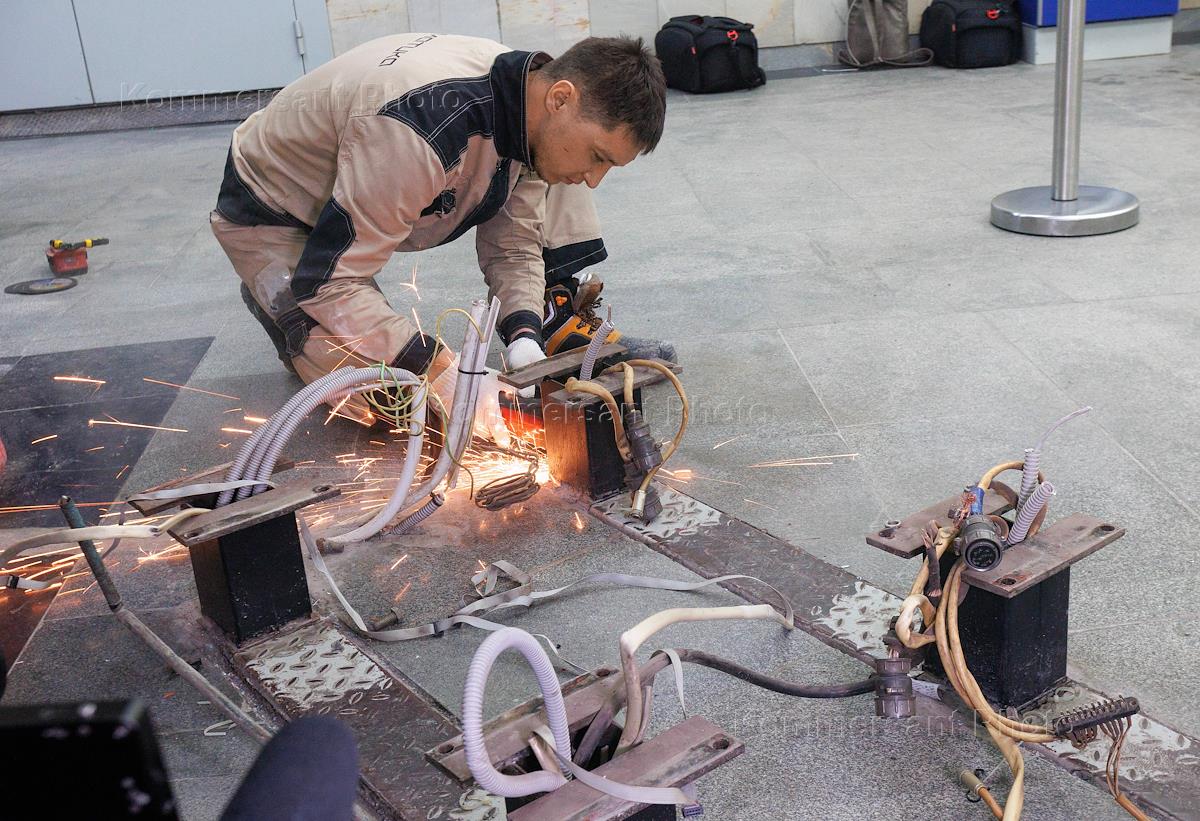 Замена турникетов на станции метро "Площадь 1905 года". Жанровая фотография. Рабочие во время ремонта турникетов.