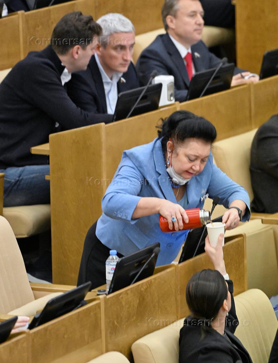Пленарное заседание Государственной думы (ГД) России. Член комитета ГД России по охране здоровья Тамара Фролова (справа) и заместитель председателя комитета ГД России по строительству и жилищно-коммунальному хозяйству Николай Алексеенко (слева) во время заседания.