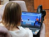 Трансляция программы "Итоги года с президентом России Владимиром Путиным" в Екатеринбурге. В 2023 году прямая линия с гражданами и большая ежегодная пресс-конференция с журналистами проходят в совмещенном формате. Жанровая фотография. Молодой человек в офисе смотрит трансляцию программы на ноутбуке.