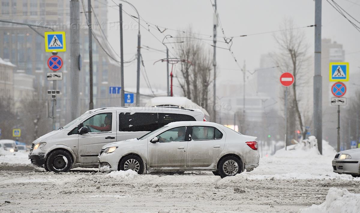 Жанровая фотография. Снегопад в городе. Последствия прихода циклона "Ваня" (Vanja). Автомобили на дороге.