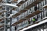 Жанровая фотография. Снегопад в городе. Последствия прихода циклона "Ваня" (Vanja). Рабочие во время ремонта фасада здания.