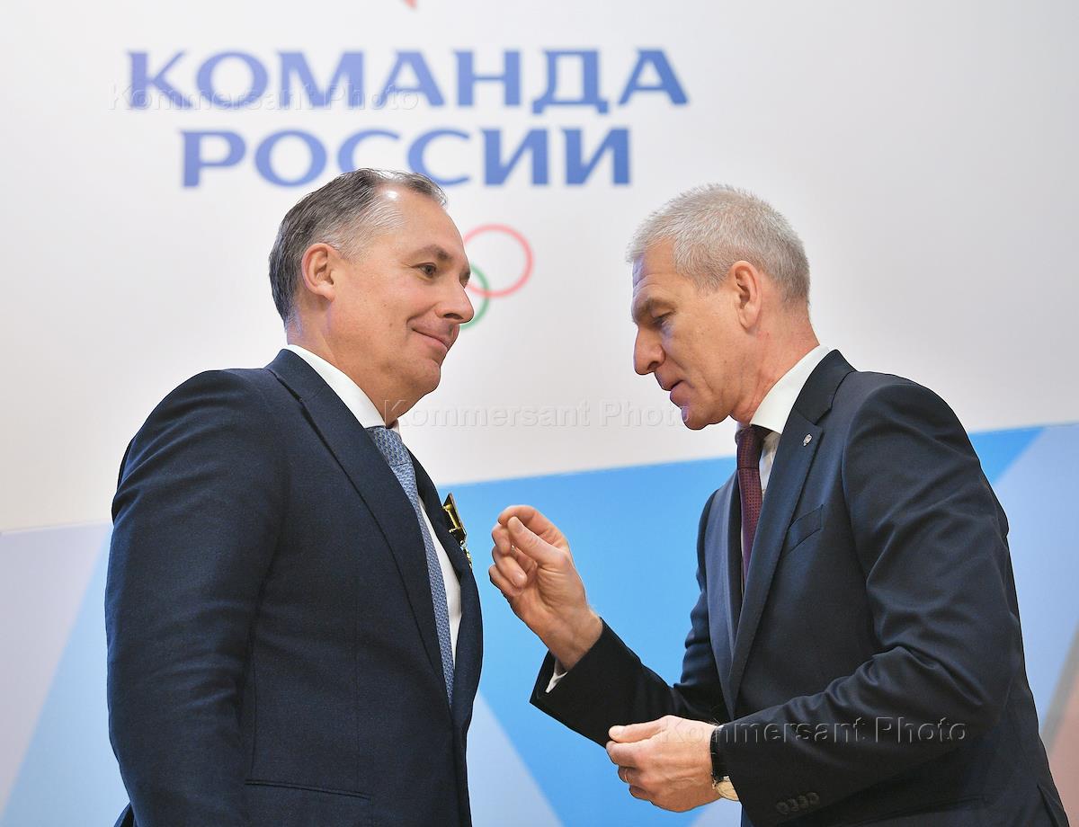 Ежегодное Олимпийское собрание Олимпийского комитета России (ОКР) в Олимпийском комитете. Генеральный директор ОКР Владимир Сенглеев (слева) и министр спорта России Олег Матыцин (справа) во время собрания.