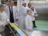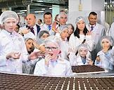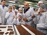 Председатель правительства России Михаил Мишустин (в центре) во время посещения предприятия холдинга "Объединенные кондитеры" в рамках акции "Елка желаний".