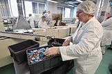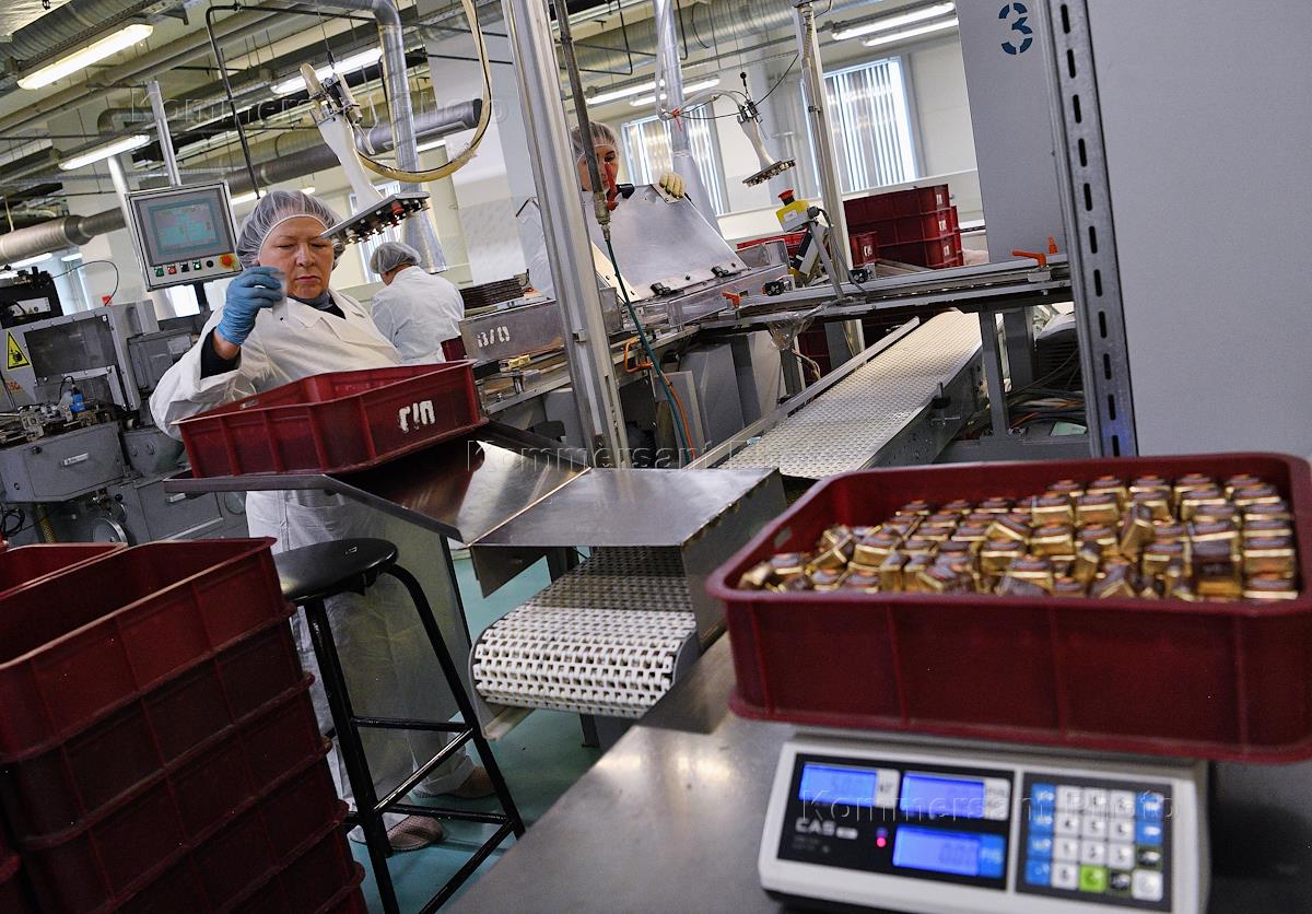 Предприятие холдинга "Объединенные кондитеры". Жанровая фотография. Сотрудница предприятия во время подготовки конфет к упаковке.