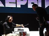 Форум "Мой бизнес. E-COM" в здании Поволжского государственного университета физической культуры, спорта и туризма (ПГУФКСиТ). Основатель и генеральный директор компании Wildberries Татьяна Бакальчук (слева) и управляющий директор группы компаний OZON Сергей Беляков (справа) во время заседания форума.
