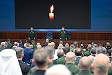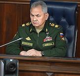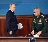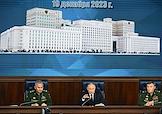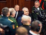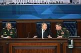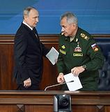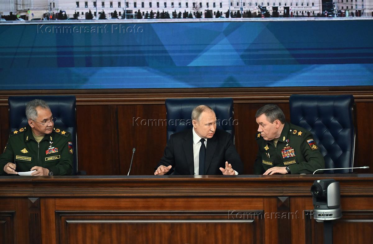 Расширенное заседание коллегии Министерства обороны России в Национальном центре управления обороной. Слева направо: министр обороны России Сергей Шойгу, президент России Владимир Путин и начальник Генерального штаба Вооруженных сил России — первый заместитель министра обороны России Валерий Герасимов во время заседания.