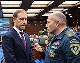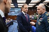 Расширенное заседание коллегии Министерства обороны России в Национальном центре управления обороной. Заместитель председателя Правительства России - министр промышленности и торговли России Денис Мантуров (в центре) и министр России по делам гражданской обороны, чрезвычайным ситуациям и ликвидации последствий стихийных бедствий (МЧС) Александр Куренков (справа) перед началом заседания.