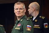 Расширенное заседание коллегии Министерства обороны России в Национальном центре управления обороной. Руководитель Департамента информации и массовых коммуникаций Министерства обороны России Игорь Конашенков перед началом заседания.