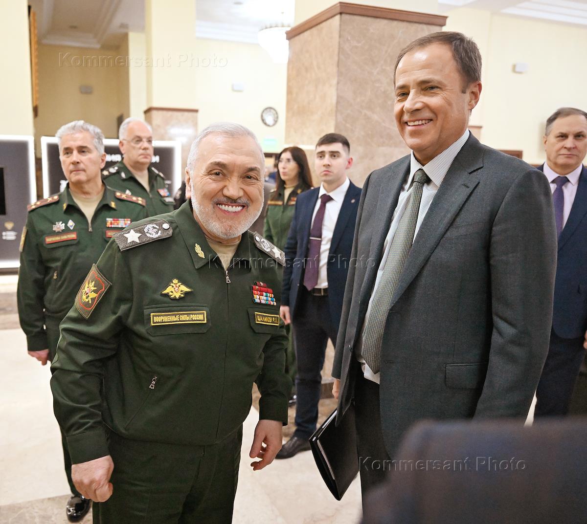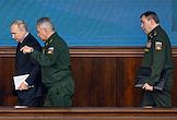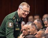 Расширенное заседание коллегии Министерства обороны России в Национальном центре управления обороной. Первый заместитель министра обороны России Руслан Цаликов (в центре) и полномочный представитель президента России в Приволжском федеральном округе Игорь Комаров (справа) после заседания.