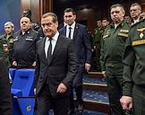 Расширенное заседание коллегии Министерства обороны России в Национальном центре управления обороной. Заместитель председателя Совета безопасности России Дмитрий Медведев (в центре) перед началом заседания.