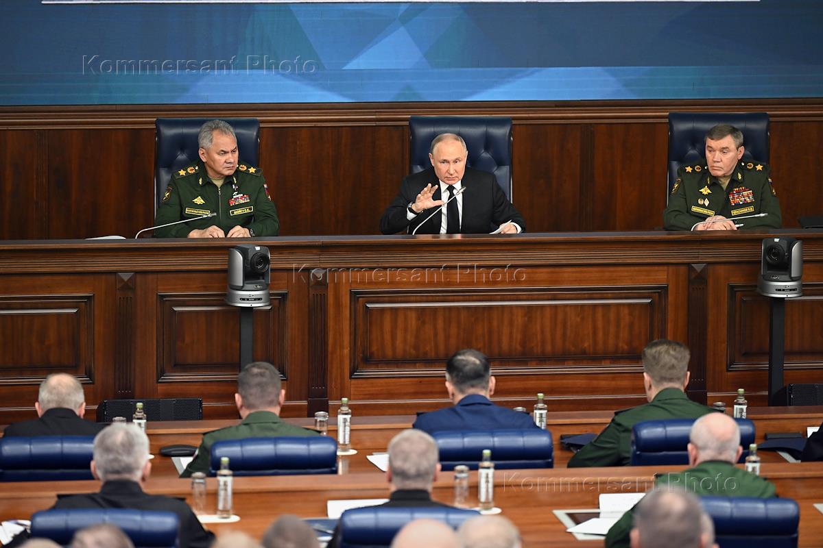 Расширенное заседание коллегии Министерства обороны России в Национальном центре управления обороной. Слева направо: министр обороны России Сергей Шойгу, президент России Владимир Путин и начальник Генерального штаба Вооруженных сил России — первый заместитель министра обороны России Валерий Герасимов во время заседания.