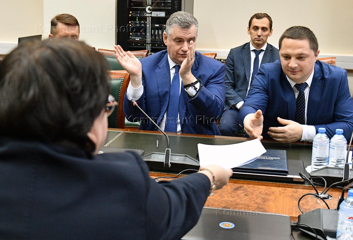 Церемония подачи документов кандидата на выборах президента России от ЛДПР, председателя партии и руководителя фракции ЛДПР в Государственной думе (ГД) России Леонида Слуцкого в Центральную избирательную комиссию (ЦИК) России. Председатель партии Либерально-демократическая партия России (ЛДПР), руководитель фракции ЛДПР в ГД России Леонид Слуцкий (в центре) и член ЦИК Александр Курдюмов (справа) перед началом церемонии.