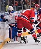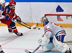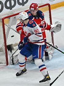 Континентальная хоккейная лига (КХЛ). Чемпионат сезона 2023/24. Матч между командами ЦСКА (Москва) - СКА (Санкт-Петербург) на стадионе "ЦСКА Арена". Вратарь команды ЦСКА Дмитрий Гамзин (справа) и игрок команды СКА Иван Зинченко (слева) во время матча.