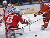 Континентальная хоккейная лига (КХЛ). Чемпионат сезона 2023/24. Матч между командами ЦСКА (Москва) - СКА (Санкт-Петербург) на стадионе "ЦСКА Арена". Вратарь команды ЦСКА Дмитрий Гамзин (в центре) во время матча.