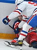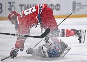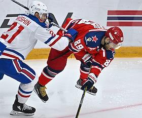 Континентальная хоккейная лига (КХЛ). Чемпионат сезона 2023/24. Матч между командами ЦСКА (Москва) - СКА (Санкт-Петербург) на стадионе "ЦСКА Арена". Игрок команды СКА Валентин Зыков (слева) и игрок команды ЦСКА Марсель Ибрагимов (справа) во время матча.
