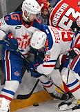 Континентальная хоккейная лига (КХЛ). Чемпионат сезона 2023/24. Матч между командами ЦСКА (Москва) - СКА (Санкт-Петербург) на стадионе "ЦСКА Арена". Игрок команды СКА Валентин Зыков (слева) и игрок команды ЦСКА Фредрик Классон (справа) во время матча.