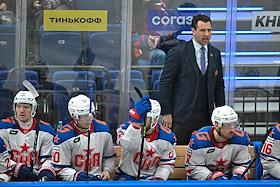 Континентальная хоккейная лига (КХЛ). Чемпионат сезона 2023/24. Матч между командами ЦСКА (Москва) - СКА (Санкт-Петербург) на стадионе "ЦСКА Арена". Главный тренер команды ЦСКА по хоккею Сергей Федоров (в центре, справа) во время матча.