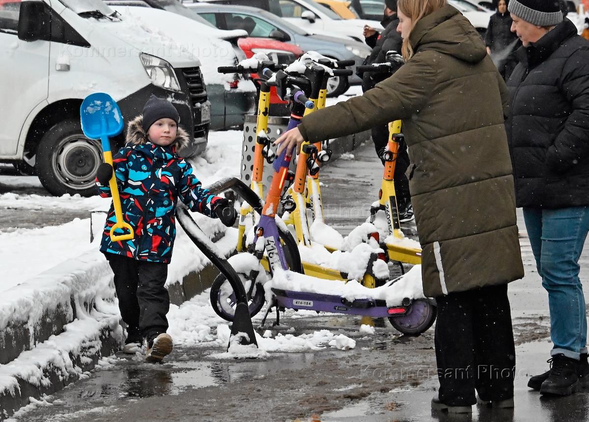 Genre photography. Snow in the city. A child with a shovel on a walk.